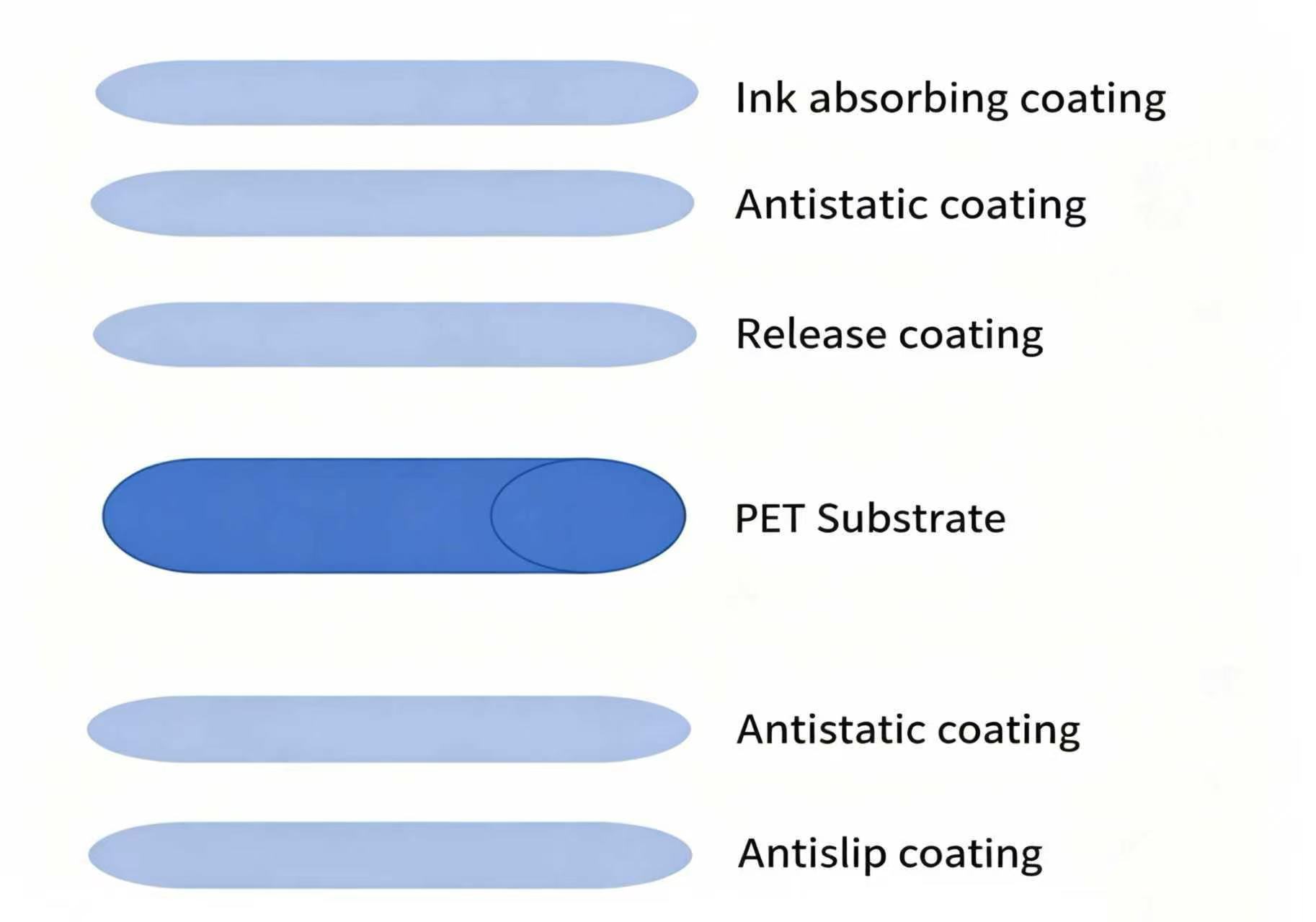 डीटीएफ फिल्म पीईटी बेस पर निर्मित होती है, जिस पर रिलीज लेयर और स्याही की कोटिंग की जाती है।-अवशोषक परत। दोहरी-साइडेड फिल्मों में एंटीस्टैटिक और एंटी के लिए एक बैक कोटिंग जोड़ी जाती है।-स्लिप ट्रीटमेंट।